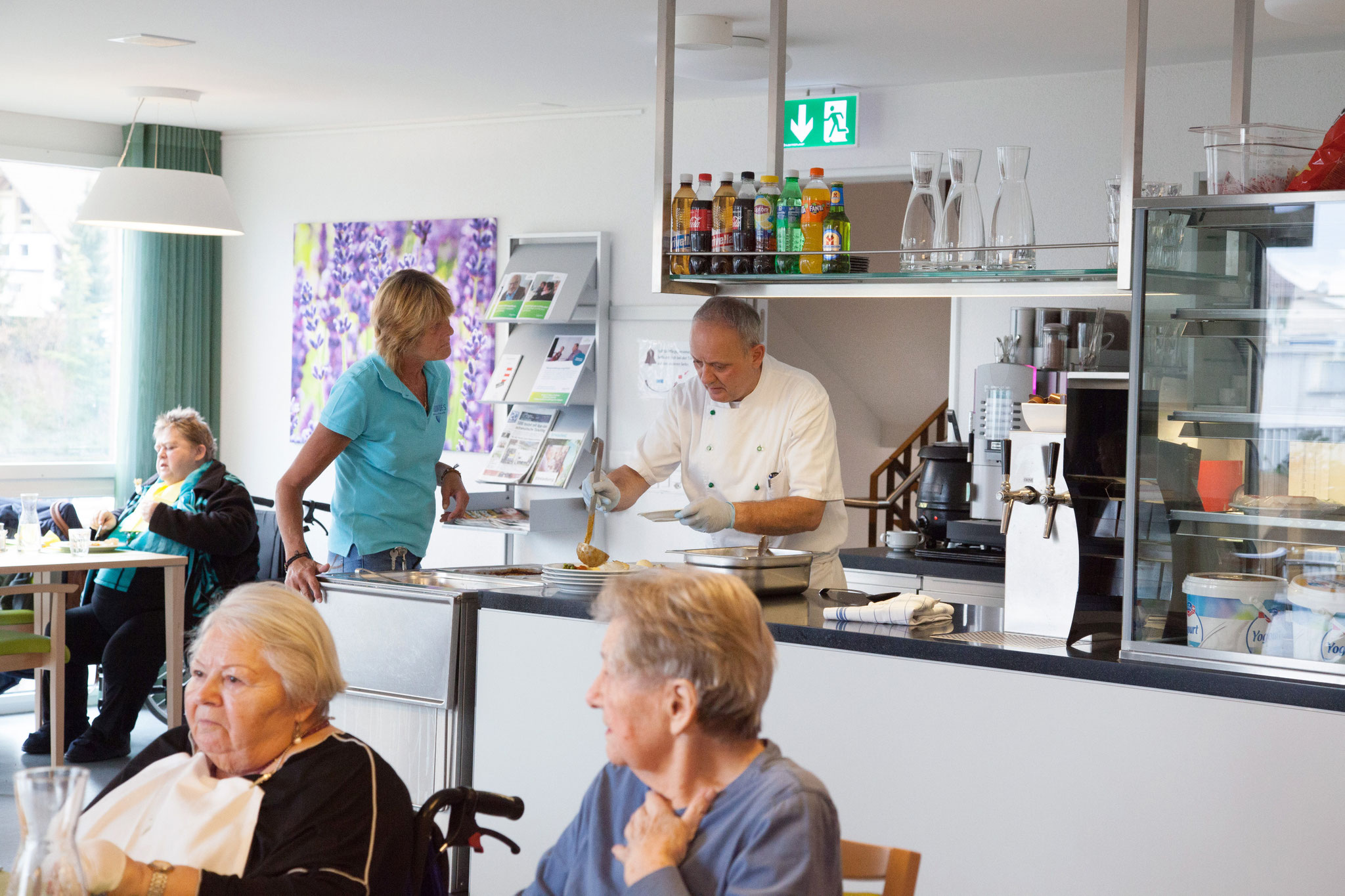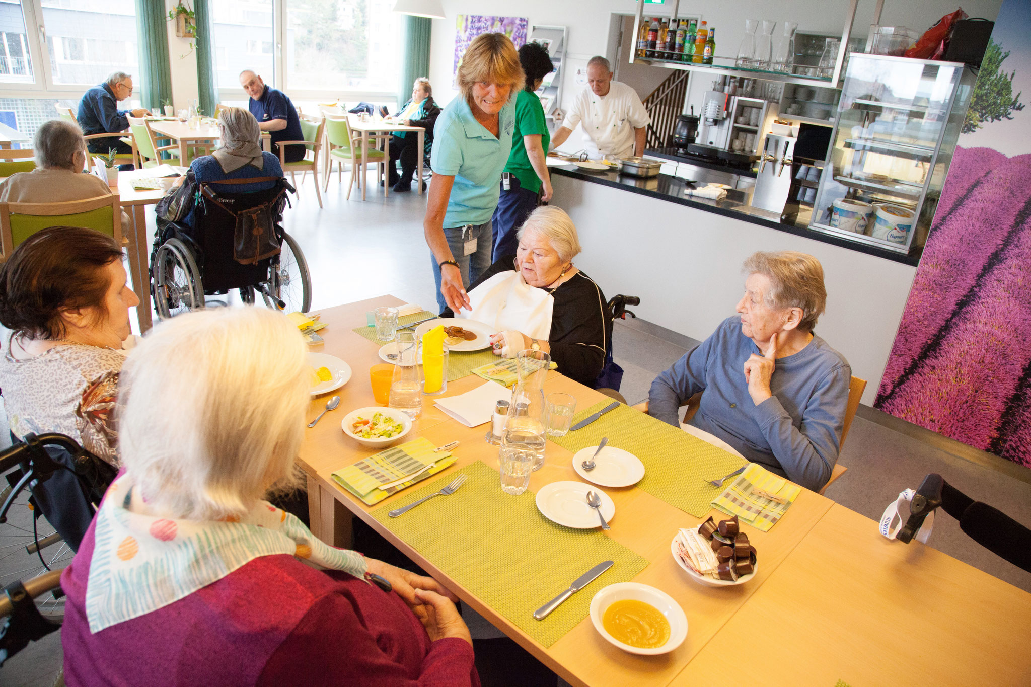 Die Heimleitung, die Leitung Hotellerie und der Küchenchef mit seinem Team sind für die Verpflegung der Bewohnerinnen und Bewohner zuständig. Sie vertreten ein ganzheitliches Ernährungsverständnis.